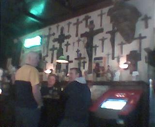 Efter musselmiddagen igår gick vi på en öl före Vanden P, tidernas protestantfästning, fullt med foton på marscherande oranjemän. In på pub i Tilburg, tidernas katolikfästning tydligen, väggarna fulla med krucifix. Men folket här trevligare, heja Maria!