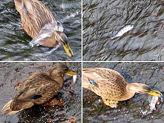 I det grunda vattnet låg en del abborrar och kippade efter andan. Tills en gräsand dök upp som började sluka alla fiskar den hittade och som rymdes genom svalget på den! Fisken längst ner till höger var för stor.