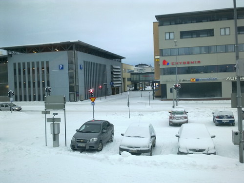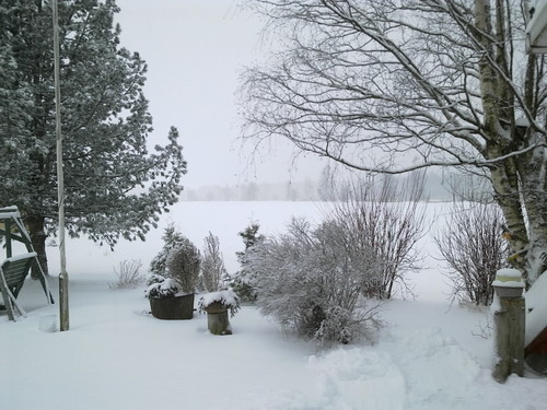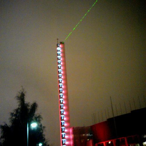 I snöväder ser stadiontornets laserstråle speciellt fin ut.